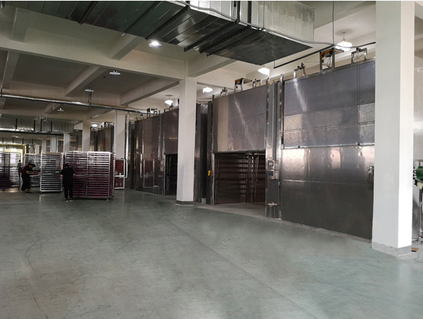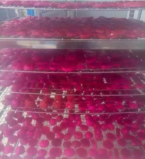 6、火龙果烘干机工艺参数的设定。设置好火龙果烘干机的温度和湿度参数。烤烤温度越高,果脯的色泽与口咸越差。其中以55-75摄氏度的温度烘烤16-20小时的效果上佳。在烘烤时,烘干房内的两个通道注意物料平衡,使火龙果片受热均匀。大的火龙果12公斤可制成1公斤火龙果干,小的火龙果14公斤