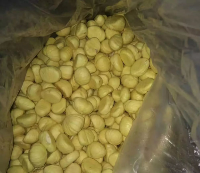 新采收的板栗,水分含量高,可溶性糖含量低,特别是里面的涩皮难以剥离,如直接加工风味不佳,并且影响产品质量。经预处理后,栗果内的部分淀粉转化为可溶性糖,并散失掉部分水分,相对地使可溶性物质的含量增加,风味转好。处理方法是将新采收的板栗放于室内,厚度4~5cm,每天翻动2~3次,堆放4~5天即可。